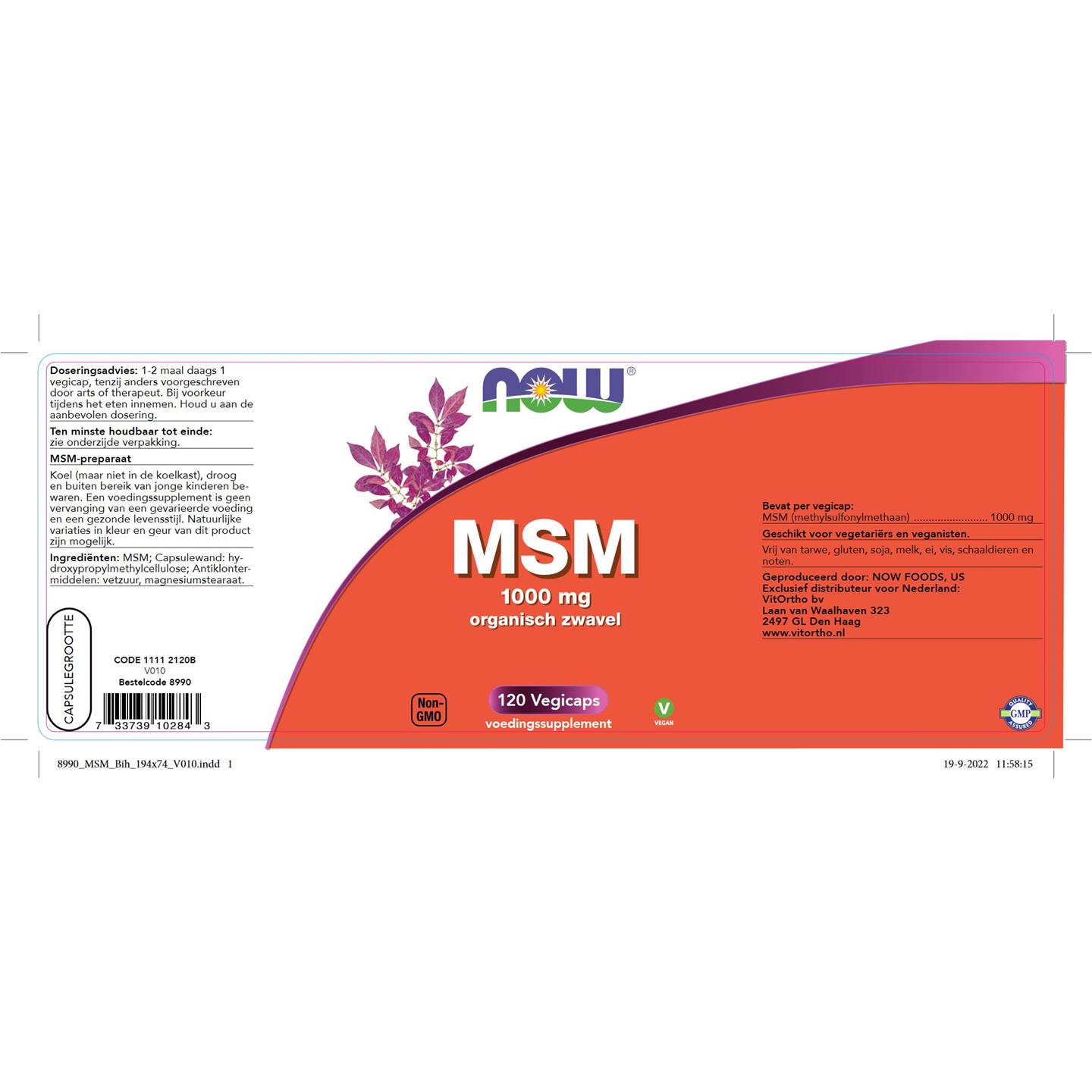 MSM (Methylsulfonylmethaan), Capsule (Hydroxypropylmethylcellulose), Antiklontermiddelen (Vetzuur, Magnesiumstearaat).