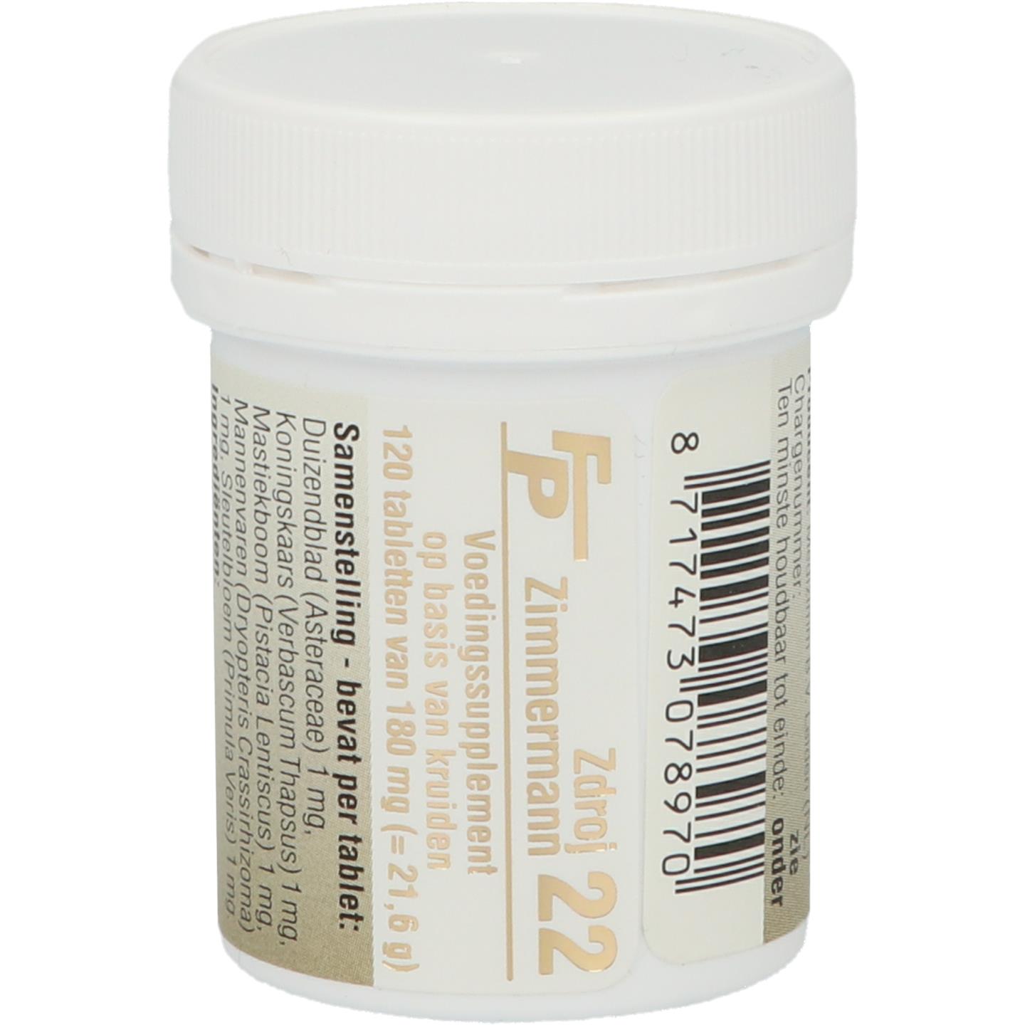 Duizendblad (Asteraceae), Koningskaars (Verbascum thapsus), Mastiekboom (Pistacia lentiscus), Mannenvaren (Dryopteris crassirhizoma), Sleutelbloem (Primula veris), Vulstof (Microkristallijne cellulose), Smaakstof (Zoethoutextract), Antiklontermiddelen (Stearinezuur, Siliciumdioxide), Magnesiumstearaat.