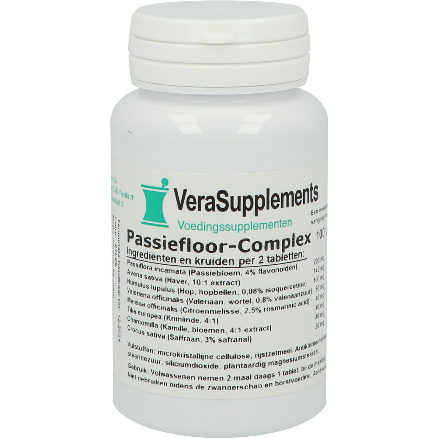 Passiflora incarnata (Passiebloem), Avena sativa (Haver, extract), Humulus lupulus (Hop, bellen), Valeriana officinalis (Valeriaan, wortel), Melissa officinalis (Citroenmelisse), Tilia europea (Krimlinde), Chamomilla (Kamille, bloemen, extract), Crocus sativa (Saffraan), Vulstoffen (Microkristallijne cellulose, Rijstzetmeel), Antiklontermiddelen (Diglyceride, Plantaardig stearinezuur, Siliciumdioxide, Plantaardig magnesiumstearaat).