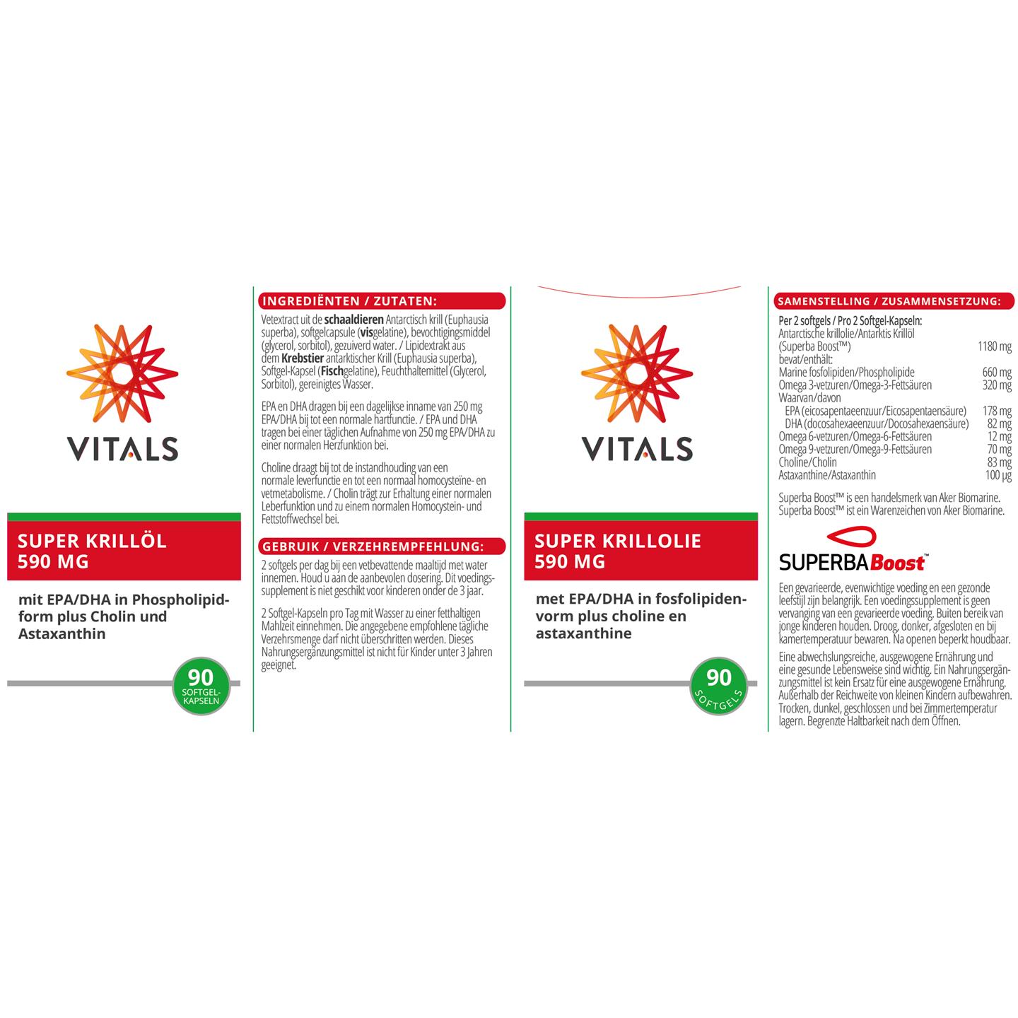 Krillolie (uit Euphausia superba) (Schaaldieren), Softgel (Visgelatine, (Vis)), Bevochtigingsmiddelen (Glycerol, Sorbitol), Gezuiverd water.