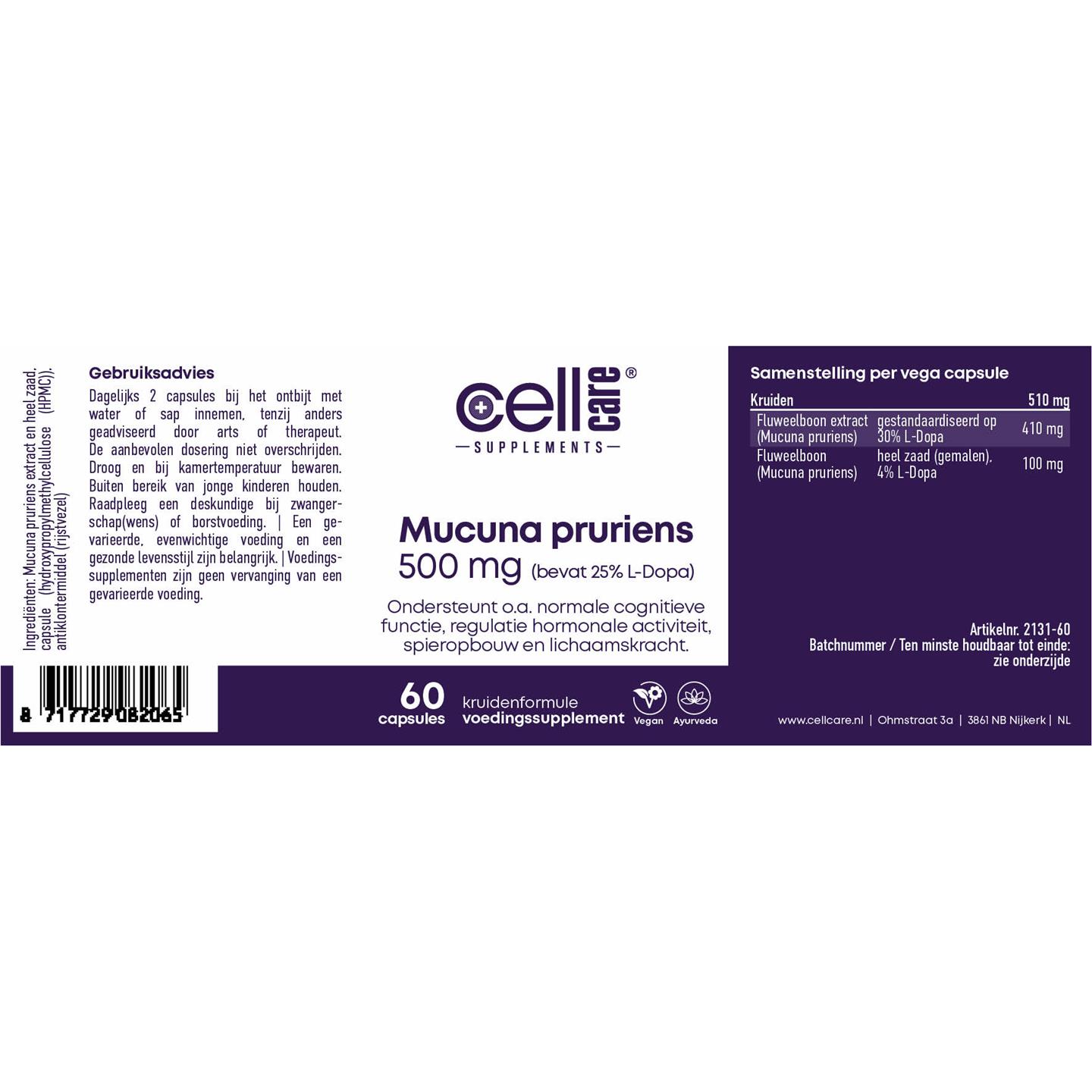 Mucuna pruriens extract en heel zaad, Capsule (Hydroxypropylmethylcellulose (HPMC)), Antiklontermiddel (Rijstvezel).