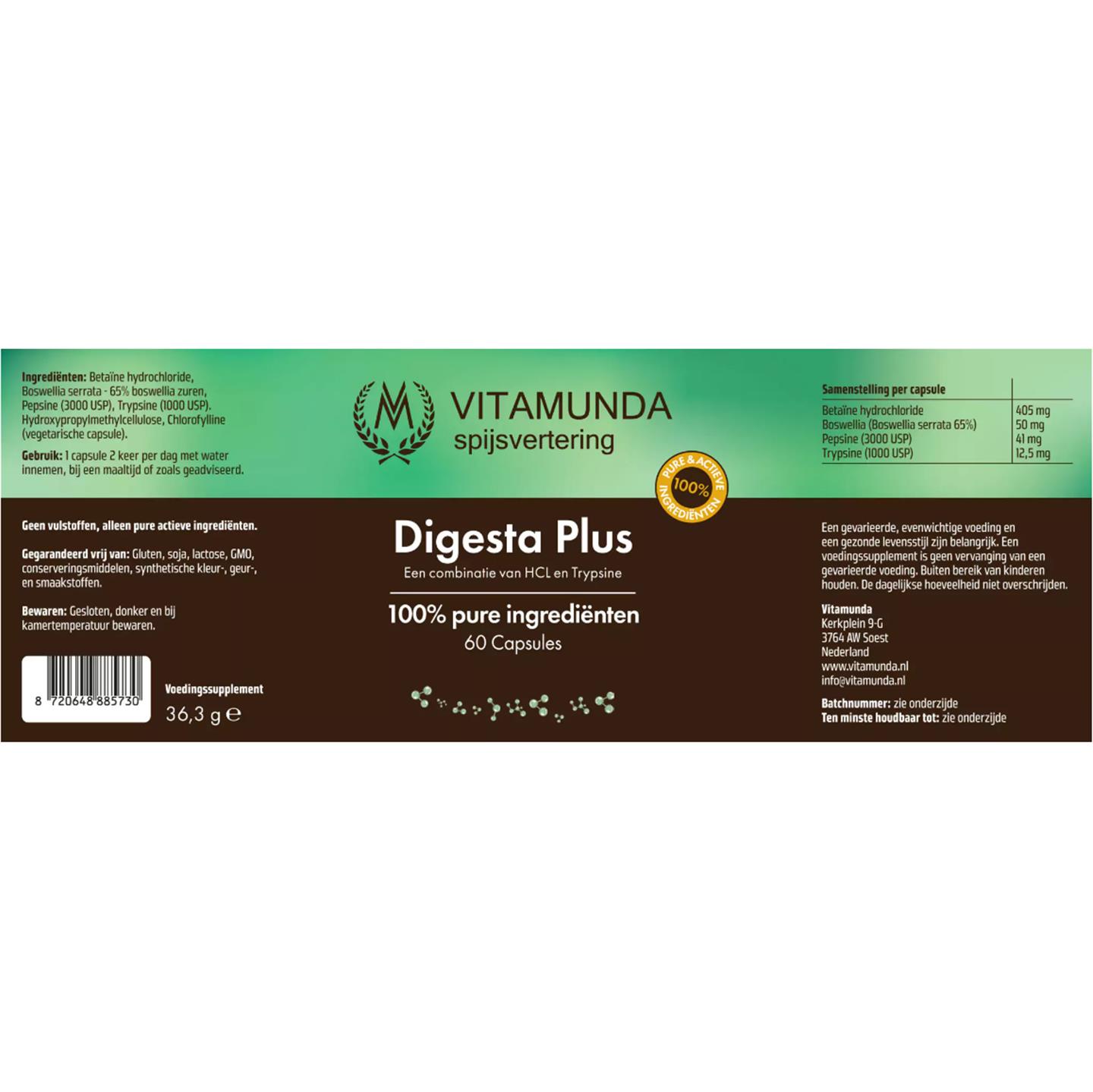 Betaïne HCl, Boswellia (Boswellia serrata), Pepsine, Trypsine, Vegetarische capsule (Hydroxypropylmethylcellulose, Chlorofylline).