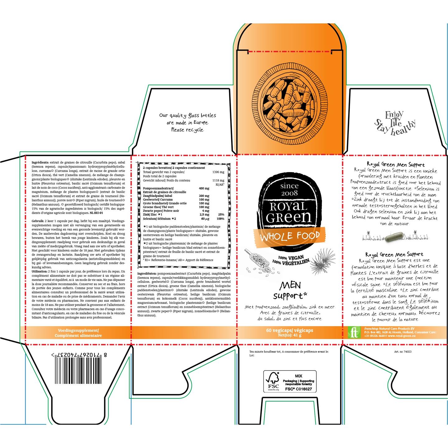 Pompoenzaadextract (Cucurbita pepo), Zaagbladpalm (Serenoa repens), Capsule/verdikkingsmiddel (Hydroxypropylmethylcellulose), Geelwortel (Curcuma longa) ☼, Grote brandnetel wortel extract (Urtica dioica), Groene thee (Camellia sinensis), Biologische paddenstoelen/plantmix ☼ (Shiitake (Lentinula edodes), Gewone oesterzwam (Pleurotus ostreatus), Heilige basilicum (Ocimum tenuiflorum), Kokosmelk (Cocos nucifera)), Antiklontermiddel (Magnesiumcarbonaat), Biologische plantenmix ☼ (Heilige basilicum (Ocimum tenuiflorum), Zonnebloempitextract (Helianthus annuus)), Zwarte peper (Piper nigrum) ☼, Zonnebloemolie (Helianthus annuus) ☼.