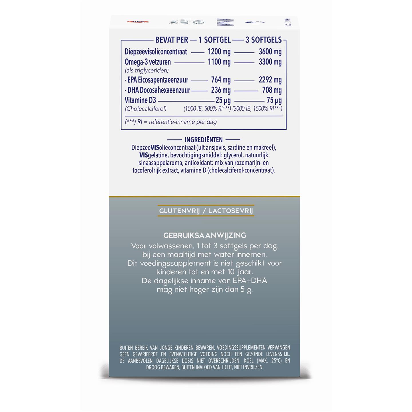 Diepzeevisolieconcentraat (uit ansjovis, sardine en makreel) (Vis), Visgelatine (Vis), Bevochtigingsmiddel (Glycerol), Natuurlijk sinaasappel aroma, Antioxidant (Mix van rozemarijn- en tocoferolrijk extract), Vitamine D3 (cholecalciferol concentraat).