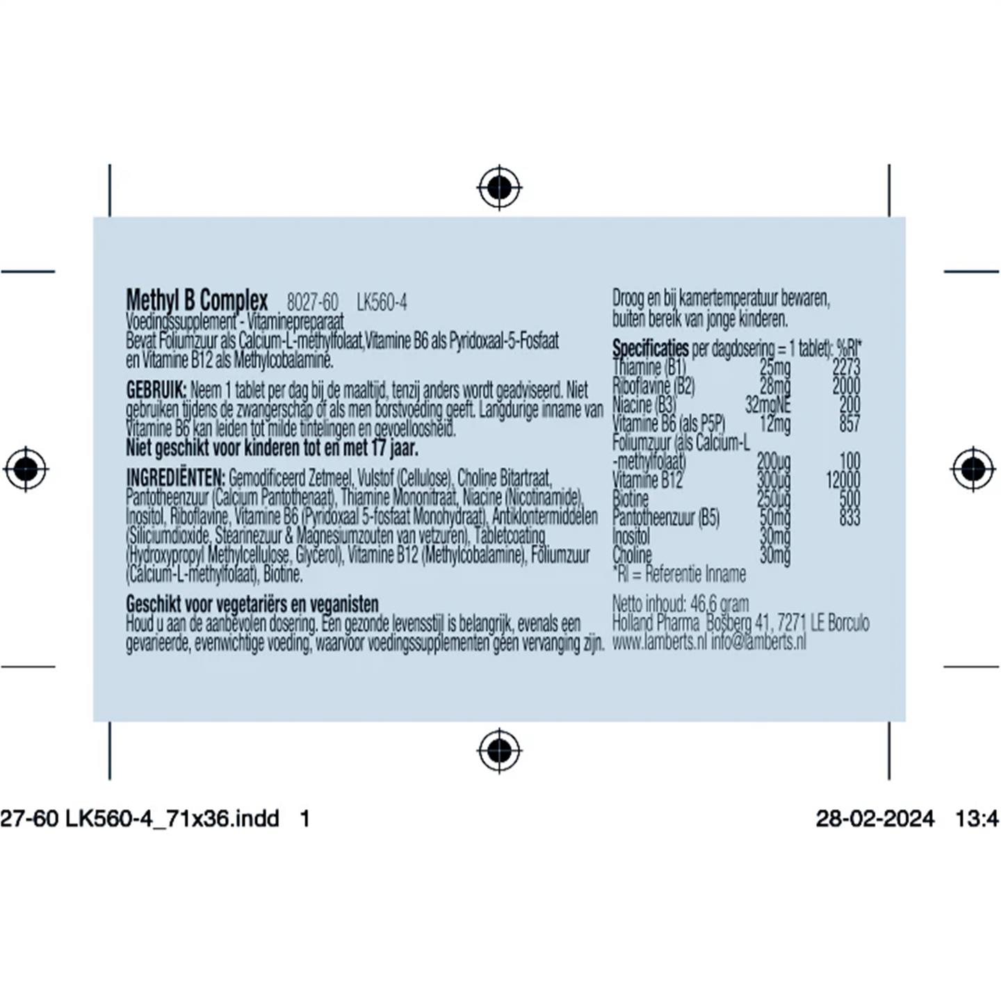 Gemodificeerd zetmeel, Vulstof (Cellulose), Choline bitartraat, Pantotheenzuur (calcium pantothenaat), Thiamine mononitraat, Niacine (nicotinamide), Inositol, Riboflavine, Vitamine B6 (pyridoxaal-5-fosfaat monohydraat), Antiklontermiddelen (Siliciumdioxide, Stearinezuur, Magnesiumzouten van vetzuren), Tabletcoating (Hydroxypropyl methylcellulose, Glycerol), Vitamine B12 (methylcobalamine), Foliumzuur (calcium-l-methylfolaat), Biotine.