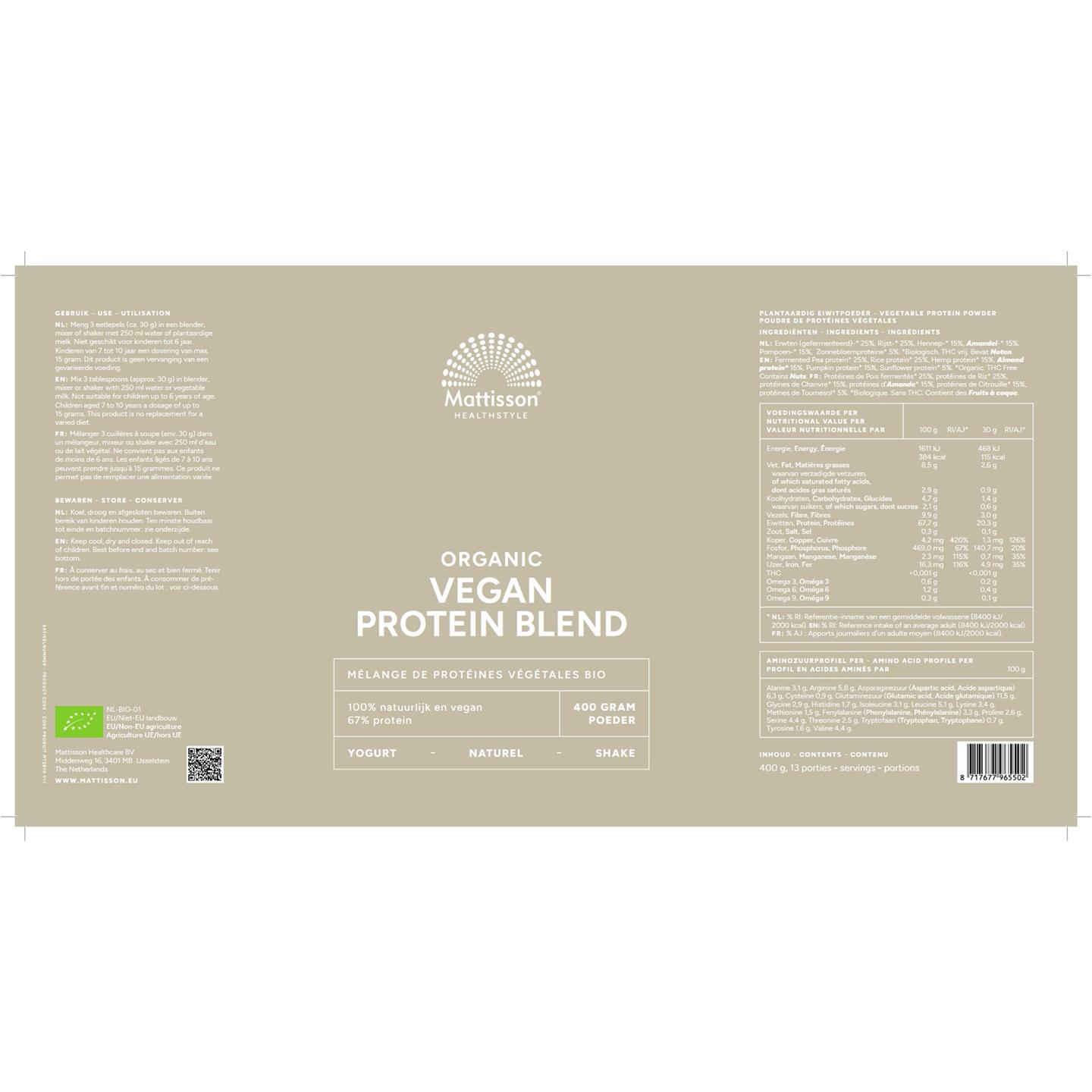 2 ruime eetlepels (circa 30 gram) mengen in blender of shaker met 250 milliliter water of smoothie. Ook te gebruiken in muesli-ontbijt of soep. Organic Vegan Protein Blend is geschikt voor dagelijks gebruik.