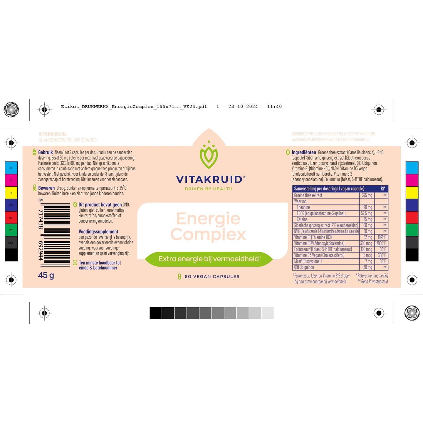 Groene thee (Camellia sinensis) extract, Capsule (HPMC), Siberische ginseng (Eleutherococcus senticosus) extract, IJzer (bisglycinaat), Rijstzetmeel, Q10 Ubiquinon, Vitamine B1 (thiamine HCl), NADH, Vitamine D3 Vegan (cholecalciferol), Saffloerolie, Vitamine B12 (adenosylcobalamine), Foliumzuur (folaat, 5-MTHF Calciumzout).