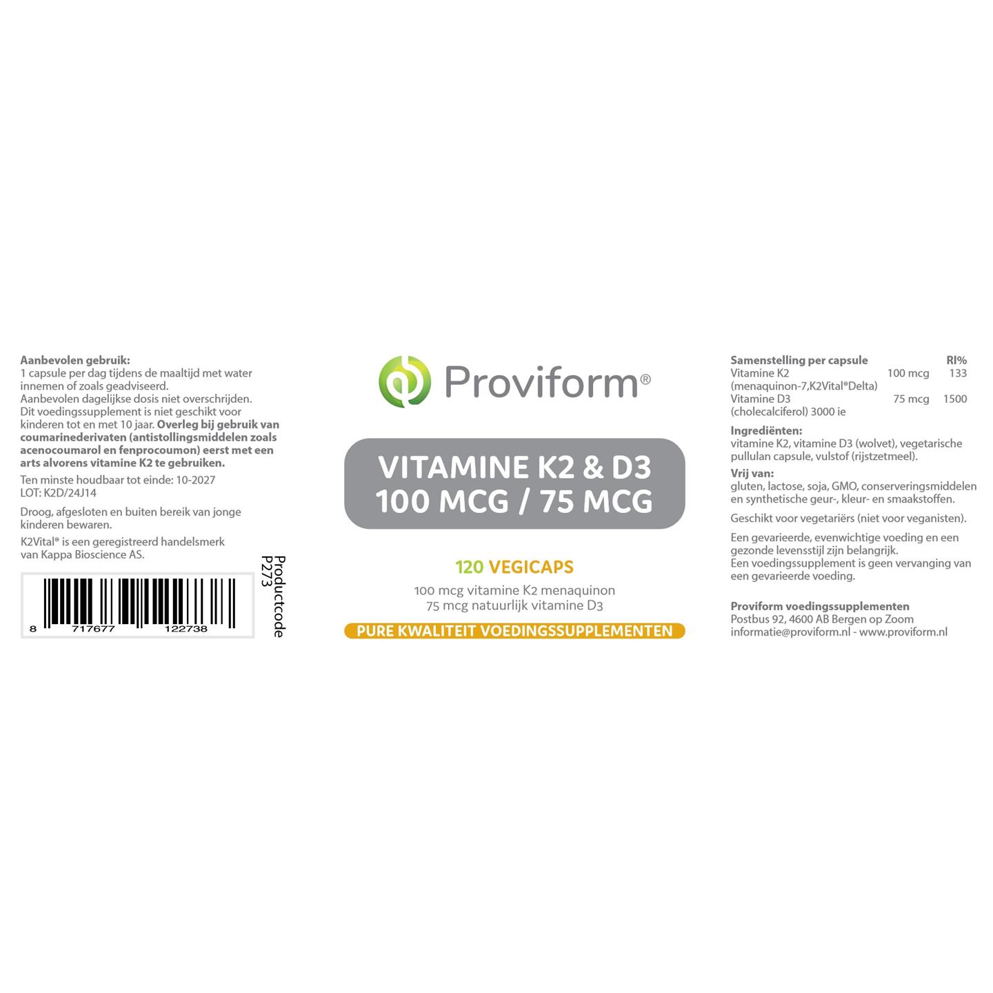 Proviform Vitamine K2 100 mcg & D3 75 mcg 120 vcaps