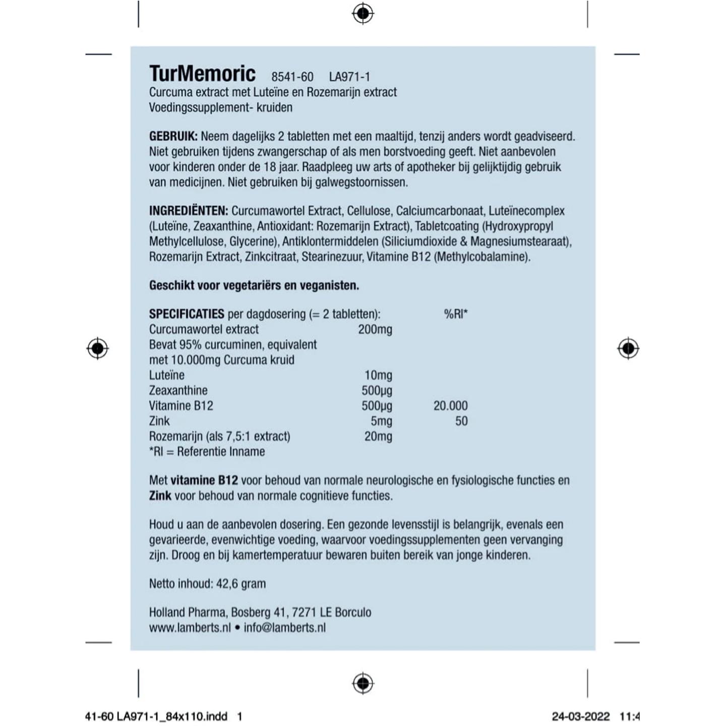 Curcuma wortel extract, Cellulose, Calciumcarbonaat, Luteïne complex (Luteïne, Zeaxanthine, Antioxidant: Rozemarijn extract), Tabletcoating (Hydroxypropylmethylcellulose, Glycerine), Antiklontermiddelen (Siliciumdioxide, Magnesiumstearaat), Rozemarijn extract, Zinkcitraat, Stearinezuur, Vitamine B12 (methylcobalamine).