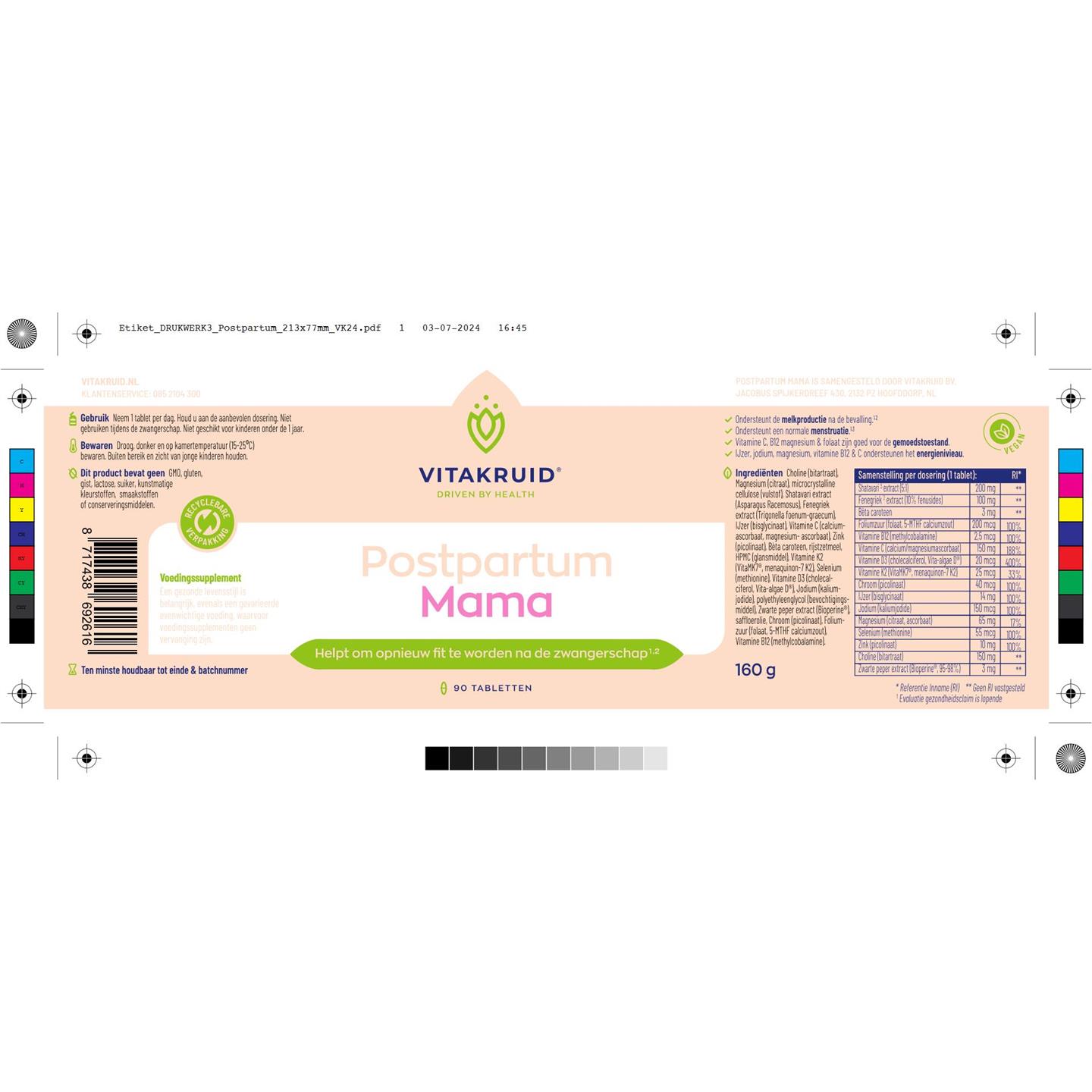 Choline (bitartraat), Magnesium (citraat), Vulstof (Microcrystalline cellulose), Shatavari (Asparagus racemosus) extract, Fenegriek (Trigonella foenum-graecum) extract, IJzer (bisglycinaat), Vitamine C (calciumascorbaat, magnesiumascorbaat), Zink (picolinaat), Bètacaroteen, Rijstzetmeel, Glansmiddel (HPMC), Vitamine K2 (VitaMK7®, Menaquinon-7 K2), Selenium (methionine), Vitamine D3 (cholecalciferol, Vita-algae D®), Jodium (kaliumjodide), Bevochtigingsmiddel (Polyethyleenglycol), Zwarte peper extract (Bioperine®), Saffloerolie, Chroom (picolinaat), Foliumzuur (folaat, 5-MTHF Calciumzout), Vitamine B12 (methylcobalamine).