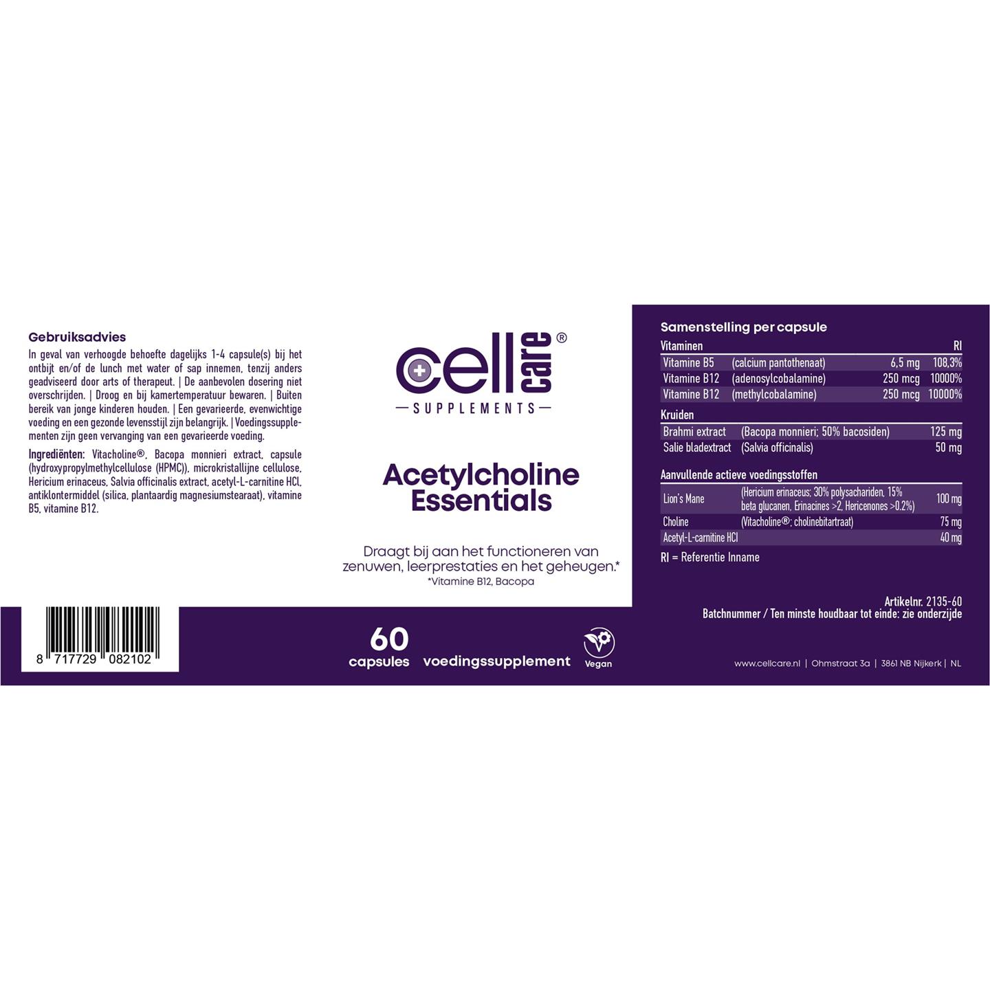 Choline (bitartraat, VitaCholine®), Brahmi (Bacopa monnieri) extract, Capsule (Hydroxypropylmethylcellulose), Microkristallijne cellulose, Lion’s Mane (Hericium erinaceus), Salie (Salvia officinalis) blad extract, Acetyl-L-carnitine HCl, Antiklontermiddelen (Silica, Plantaardig magnesiumstearaat), Vitamine B5 (calciumpantothenaat), Vitamine B12 (adenosylcobalamine, methylcobalamine).