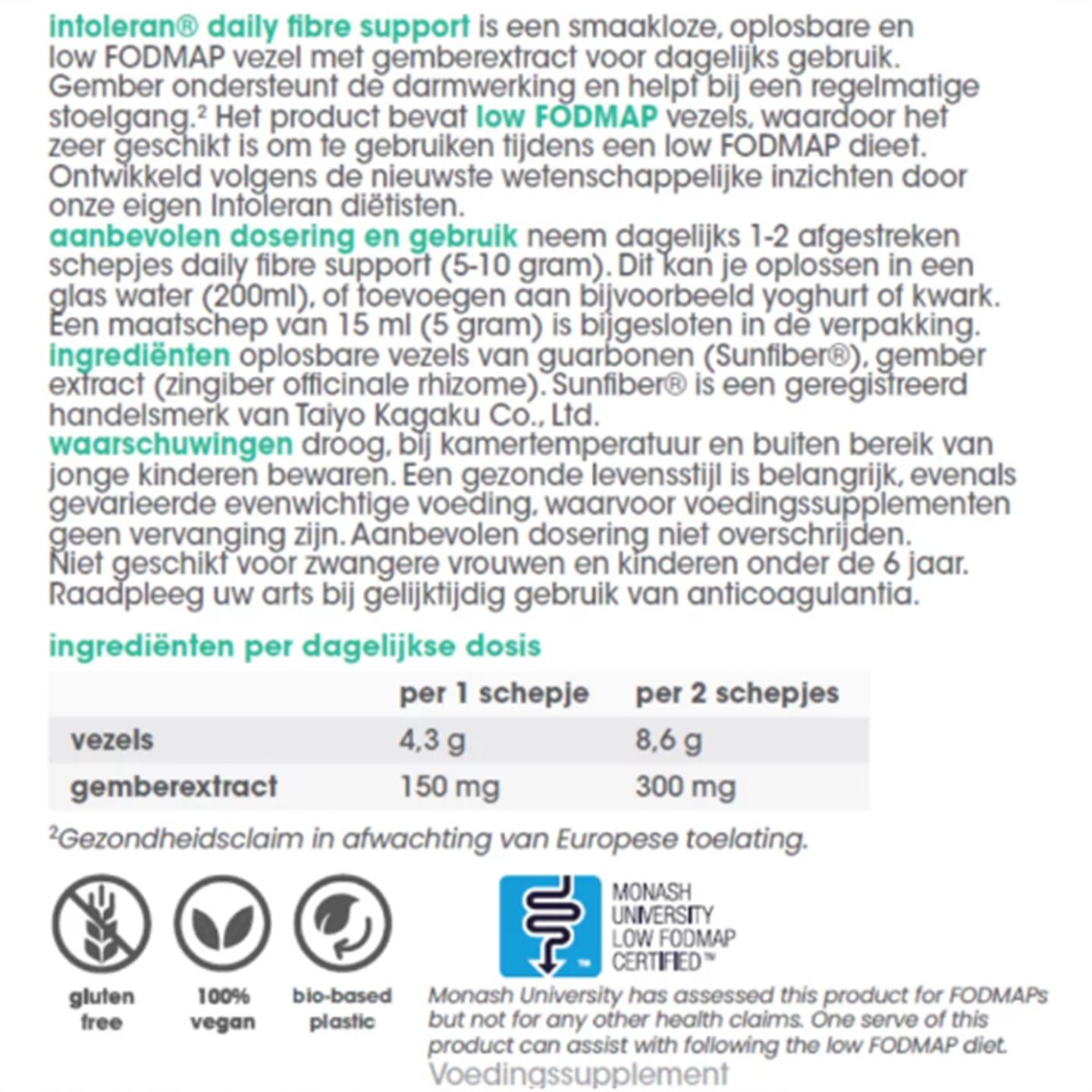 Neem dagelijks 1-2 afgestreken schepjes Daily Fiber Support (5-10 gram). Dit kan je oplossen in een glas water (200 milliliter), of toevoegen aan bijvoorbeeld yoghurt of kwark. Aanbevolen dosering niet overschrijden.