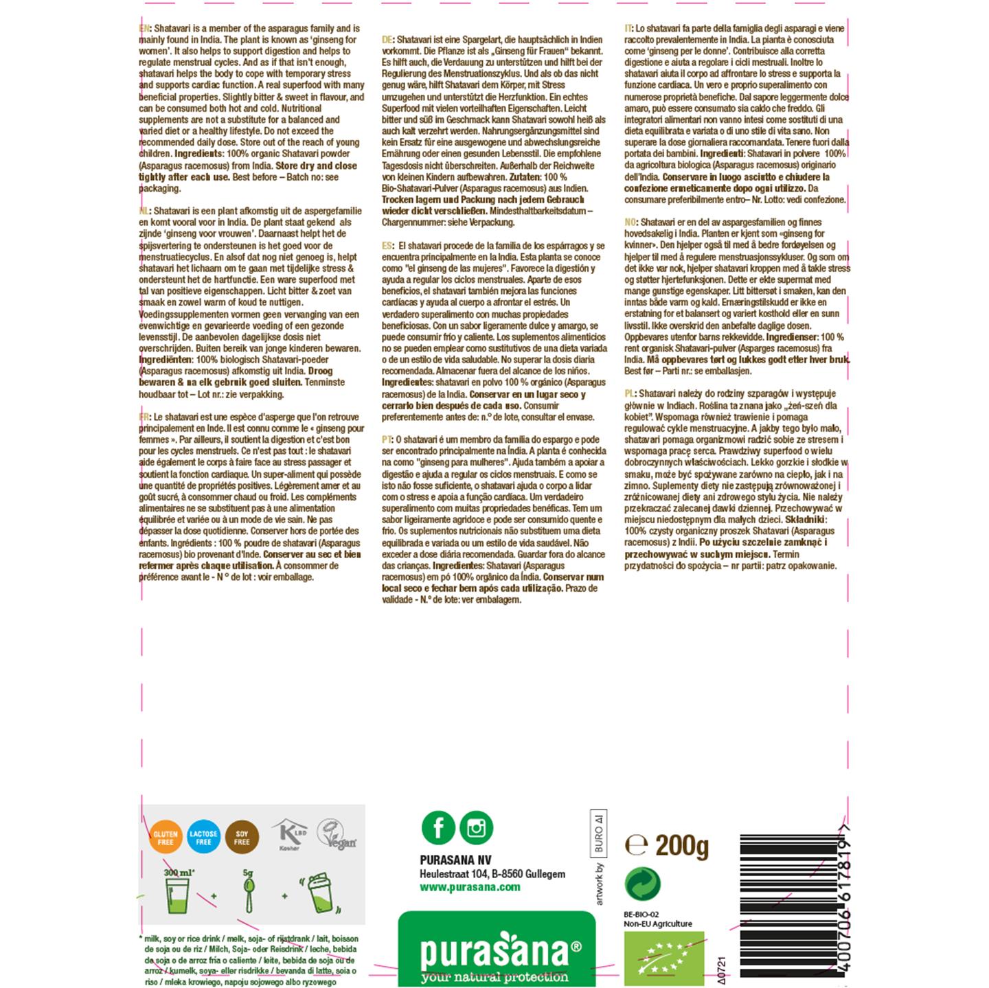 Purasana shatavari is bitterzoet van smaak en lekker in sappen, smoothies, shakes of yoghurt. Een goede richtlijn qua dosering is 5 gram in 300 milliliter vloeistof, dat mag zowel koud als warm zijn. De aanbevolen dosis niet overschrijden.