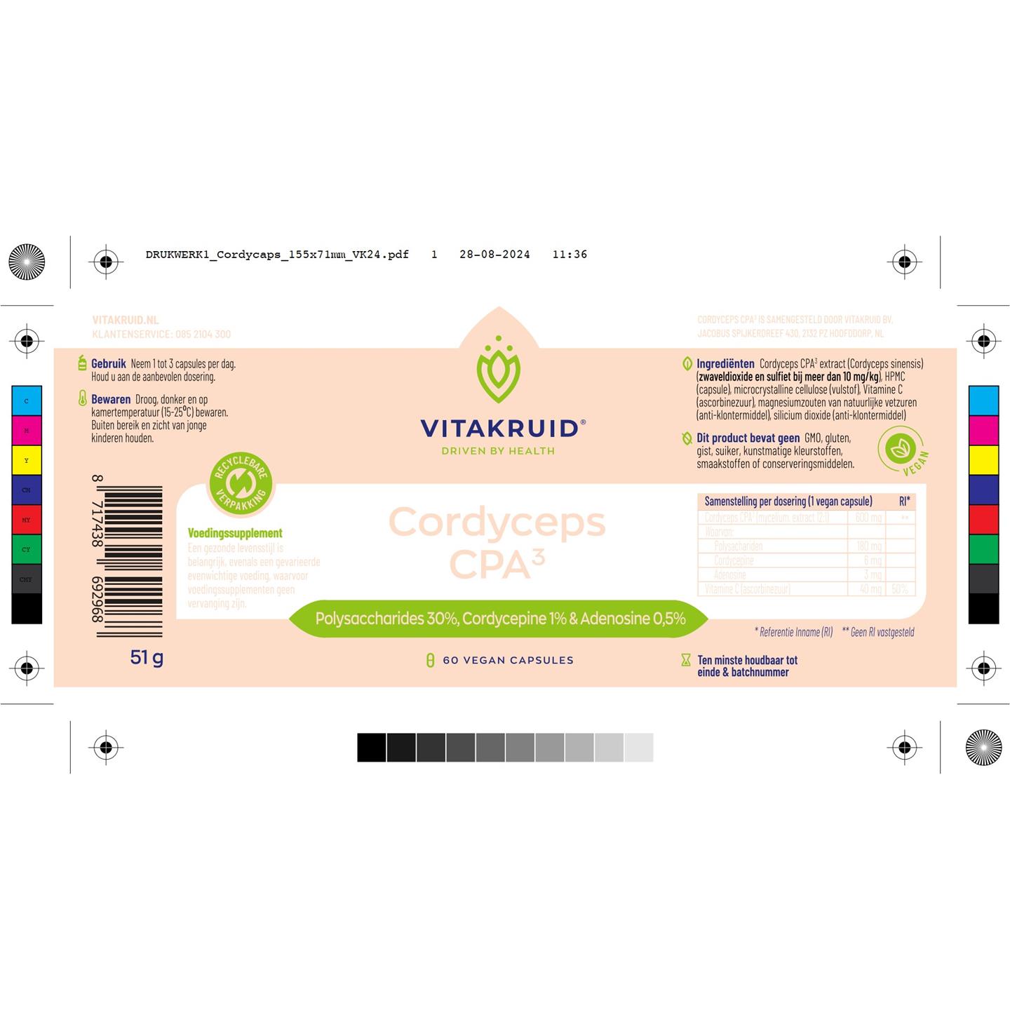 Cordyceps CPA3 extract (Cordyceps sinensis) (Zwaveldioxide en sulfiet bij meer dan 10 mg/kg), HPMC (Capsule), Microcrystalline cellulose (Vulstof), Vitamine C (ascorbinezuur), Magnesiumzouten van vetzuren (Antiklontermiddel), Siliciumdioxide (Antiklontermiddel).