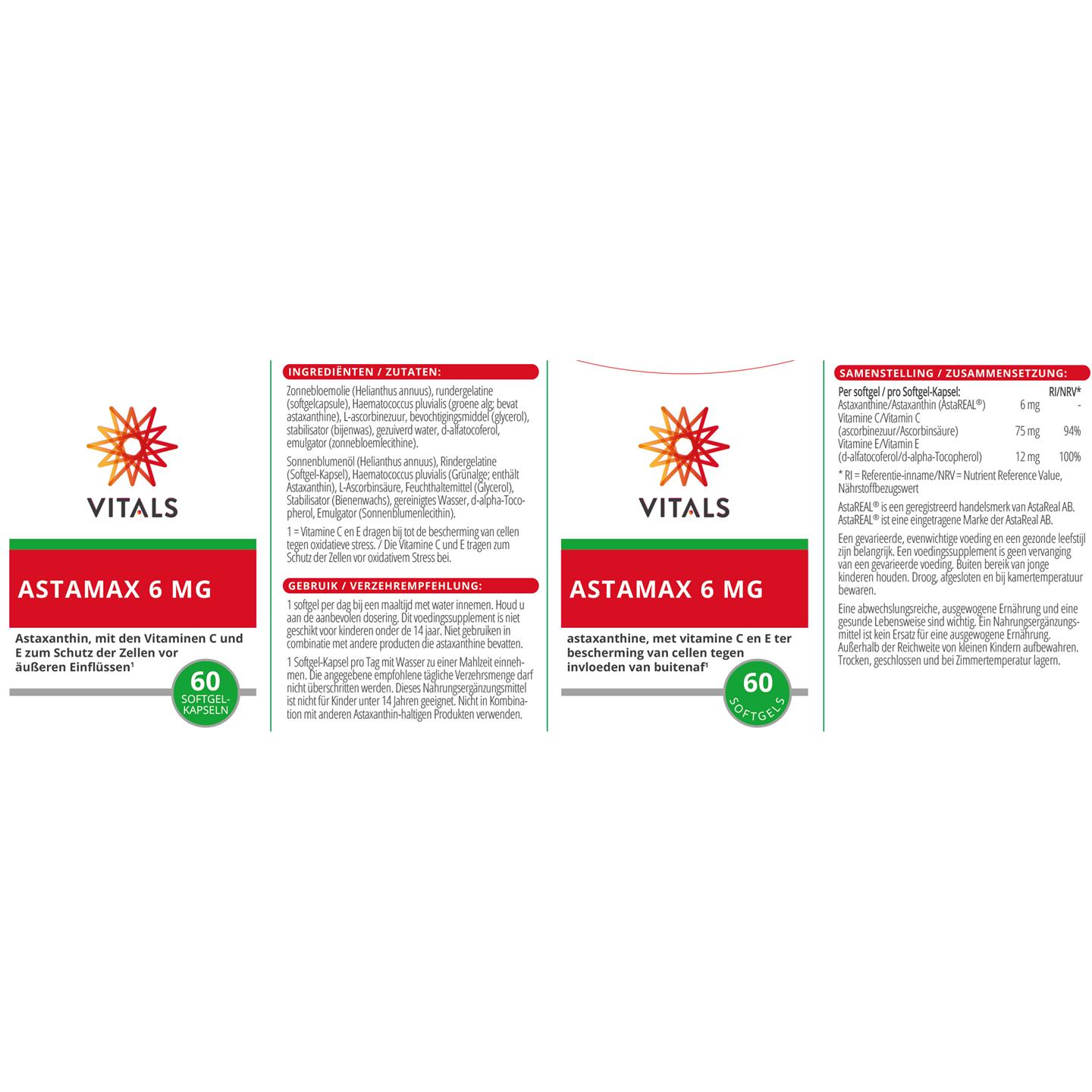Zonnebloemolie (Helianthus annuus), Softgel (Rundergelatine), Groene alg (Haematococcus pluvialis) (Astaxanthine), Vitamine C (ascorbinezuur), Bevochtigingsmiddel (Glycerol), Stabilisator (Bijenwas), Gezuiverd water, Vitamine E (d-alfa-tocoferol), Emulgator (Zonnebloemlecithine).