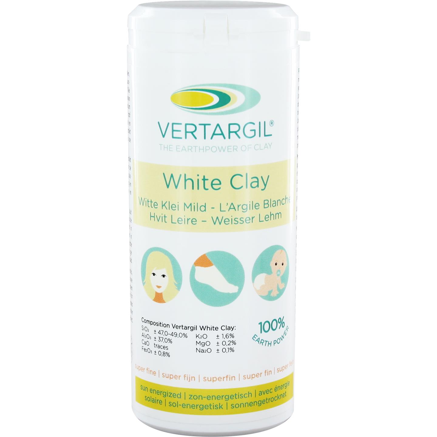 Witte leem is speciaal geschikt voor de gevoelige huid, de rode huid en de babyhuid. Naar behoefte op de gewenste plek strooien en eventueel licht inmasseren.