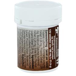 Rode zonnehoed (Echinacea purpurea) extract, Propolis extract, Bonenkruid (Satureja hortensis) extract, Echte tijm (Thymus vulgaris) extract, Vulstof (Microkristallijne cellulose), Smaakstof (Zoethoutextract), Antiklontermiddelen (Stearinezuur, Siliciumdioxide), Magnesiumstearaat.