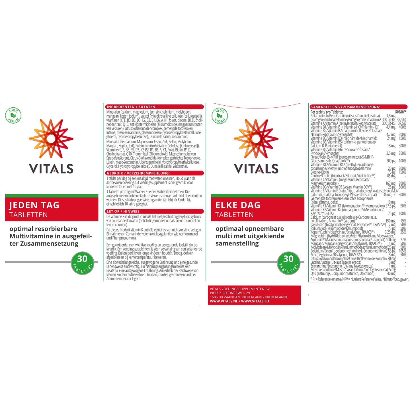 Mineralen (Calcium, Magnesium, IJzer, Zink, Selenium, Molybdeen, Mangaan, Koper, Jodium), Vulstof (Microkristallijne cellulose (cellulosegel)), Vitaminen (C, E, B3, B5, D3, K2, B2, B1, B6, A, K1, Folaat, Biotine, B12), Cholinebitartraat, Q10, Antiklontermiddelen (Siliciumdioxide, Magnesiumzouten van vetzuren), Citrusbioflavonoïdencomplex, Gemengde tocoferolen, Luteïne, Meso-zeaxanthine, Glansmiddelen (Hydroxypropylmethylcellulose, Glycerol, Hydroxypropylcellulose), Dunaliella salina, Zeaxanthine.