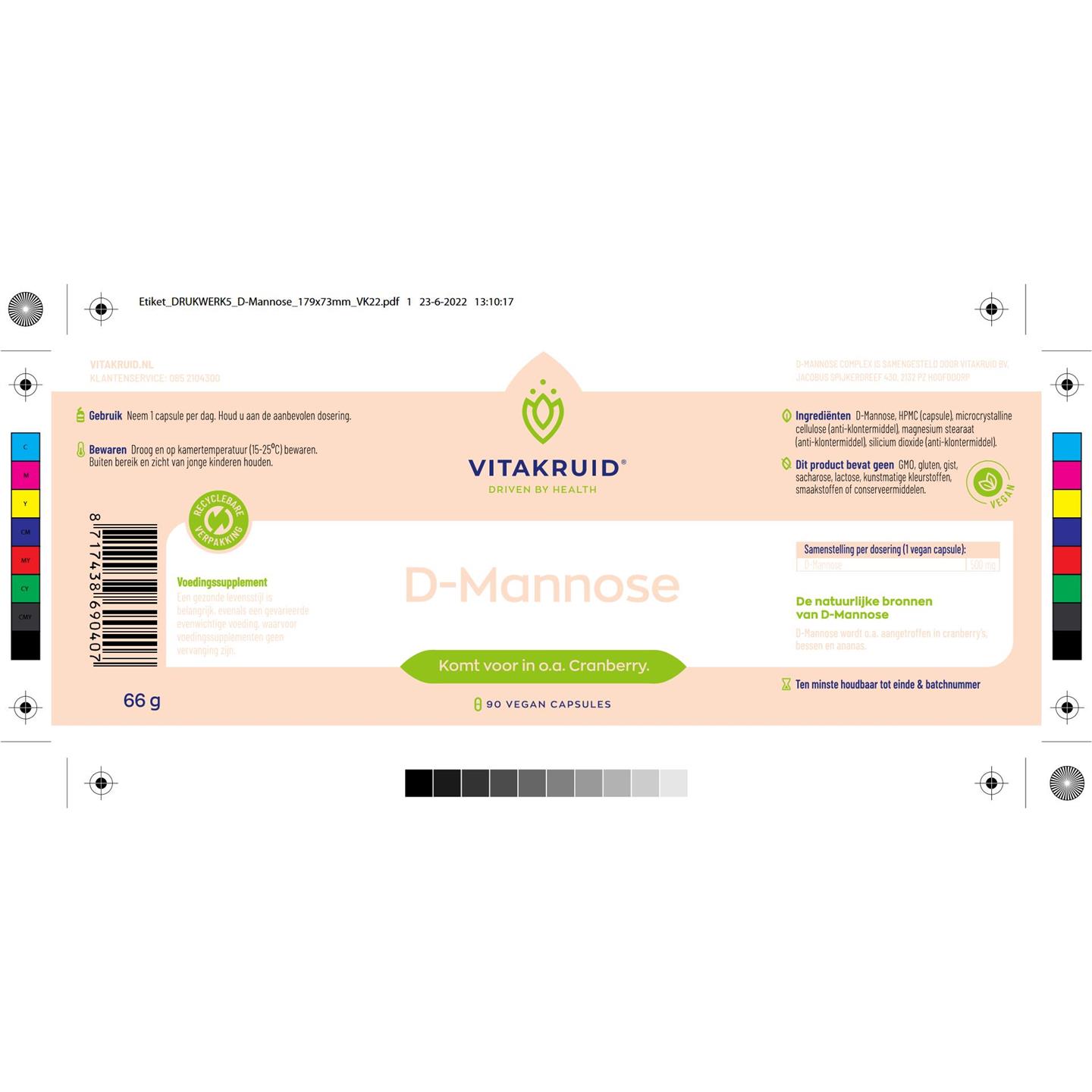 D-Mannose, Capsule (Hydroxypropylmethylcellulose), Antiklontermiddelen (Microkristallijne cellulose, Magnesiumstearaat, Siliciumdioxide).
