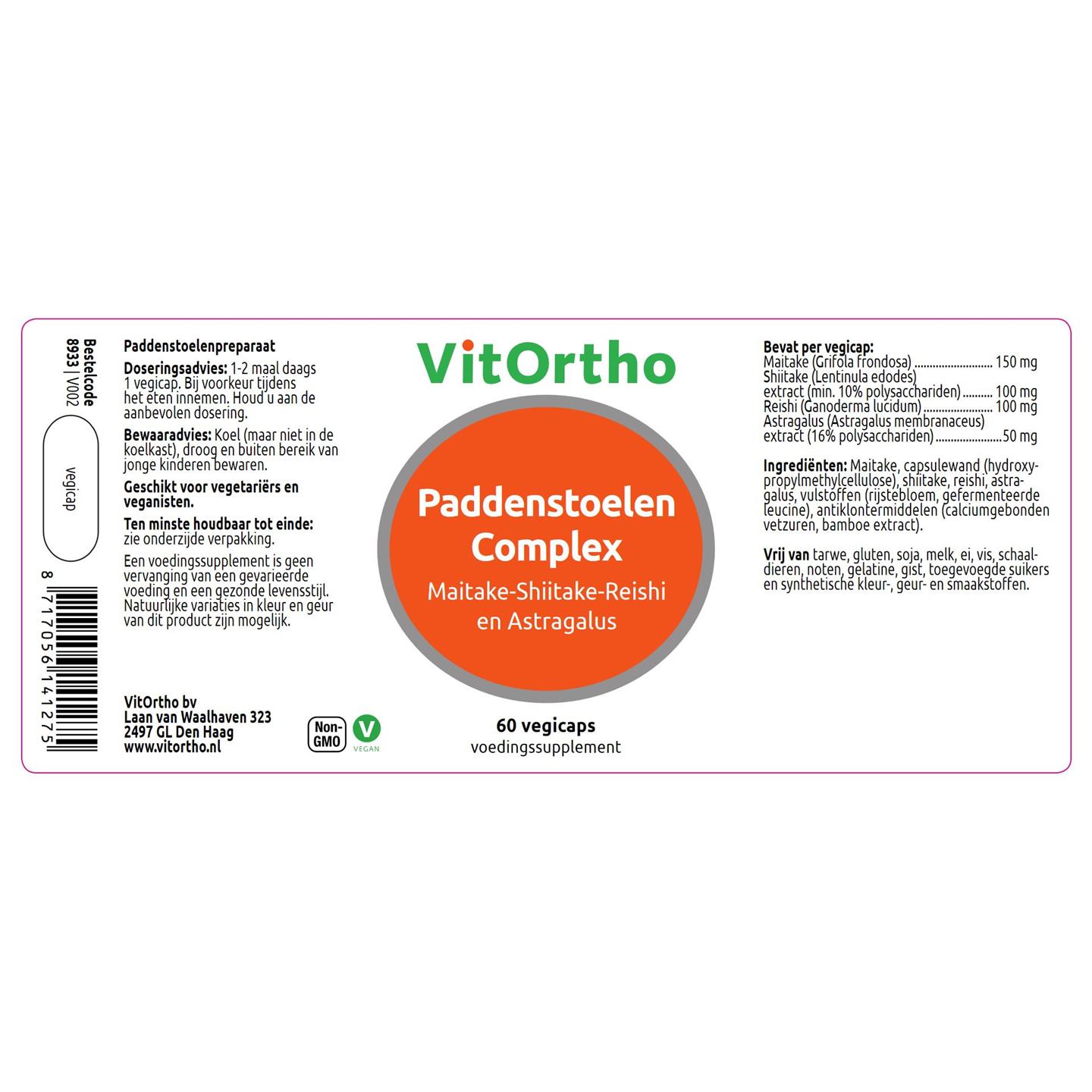 Maitake (Grifola frondosa), Capsule (Hydroxypropylmethylcellulose), Shii-take (Lentinus edodus) extract, Reishi (Ganoderma lucidum), Astragalus (Astragalus membranaceus) extract, Vulstoffen (Rijstebloem, Gefermenteerde leucine), Antiklontermiddelen (Calciumgebonden vetzuren, Bamboe extract).