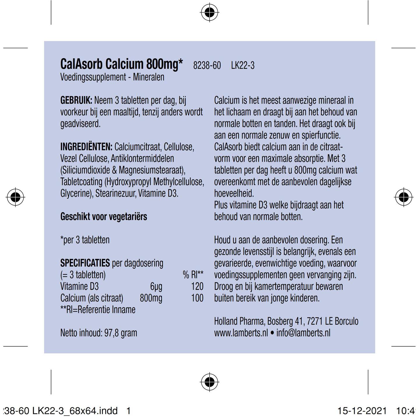 Calciumcitraat, Cellulose, Vezel cellulose, Antiklontermiddelen (Siliciumdioxide, Magnesiumstearaat), Tabletcoating (Hydroxypropylmethylcellulose, Glycerine), Stearinezuur, Vitamine D3 (cholecalciferol).