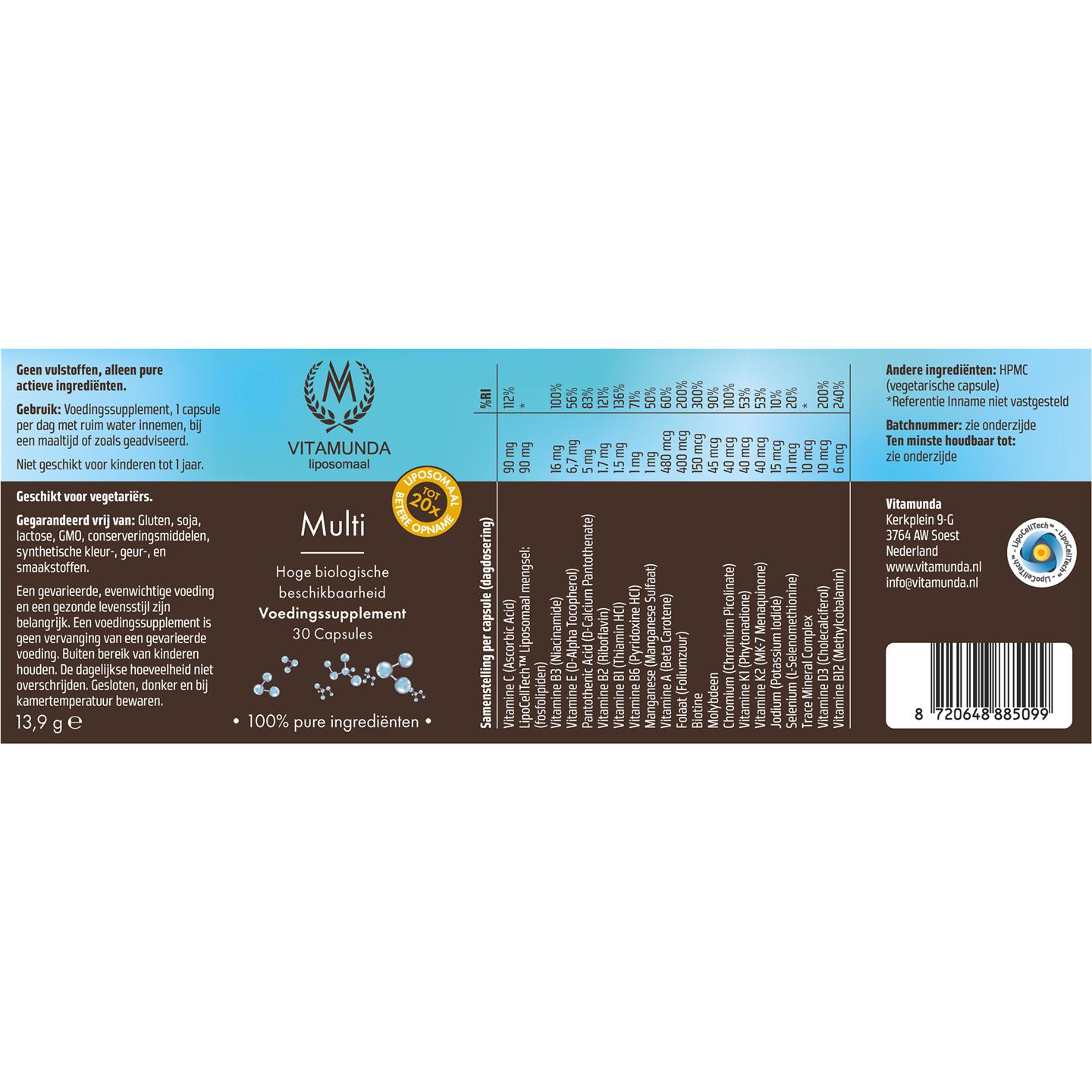 Vitamine C (ascorbinezuur), LipoCellTech® Liposomaal mengsel (Fosfolipiden), Vitamine B3 (niacinamide), Vitamine E (d-alfa-tocoferol), Vitamine B5 (D-calciumpantothenaat, pantotheenzuur), Vitamine B2 (riboflavine), Vitamine B1 (thiamine HCl), Vitamine B6 (pyridoxine HCl), Mangaansulfaat, Vitamine A (bètacaroteen), Foliumzuur (folaat), Biotine, Molybdeen, Chroompicolinaat, Vitamine K1 (fytonadion), Vitamine K2 (MK-7 Menaquinon), Kaliumjodide, L-Selenomethionine, Trace mineral complex, Vitamine D3 (cholecalciferol), Vitamine B12 (methylcobalamine), Vegetarische capsule (Hydroxypropylmethylcellulose).