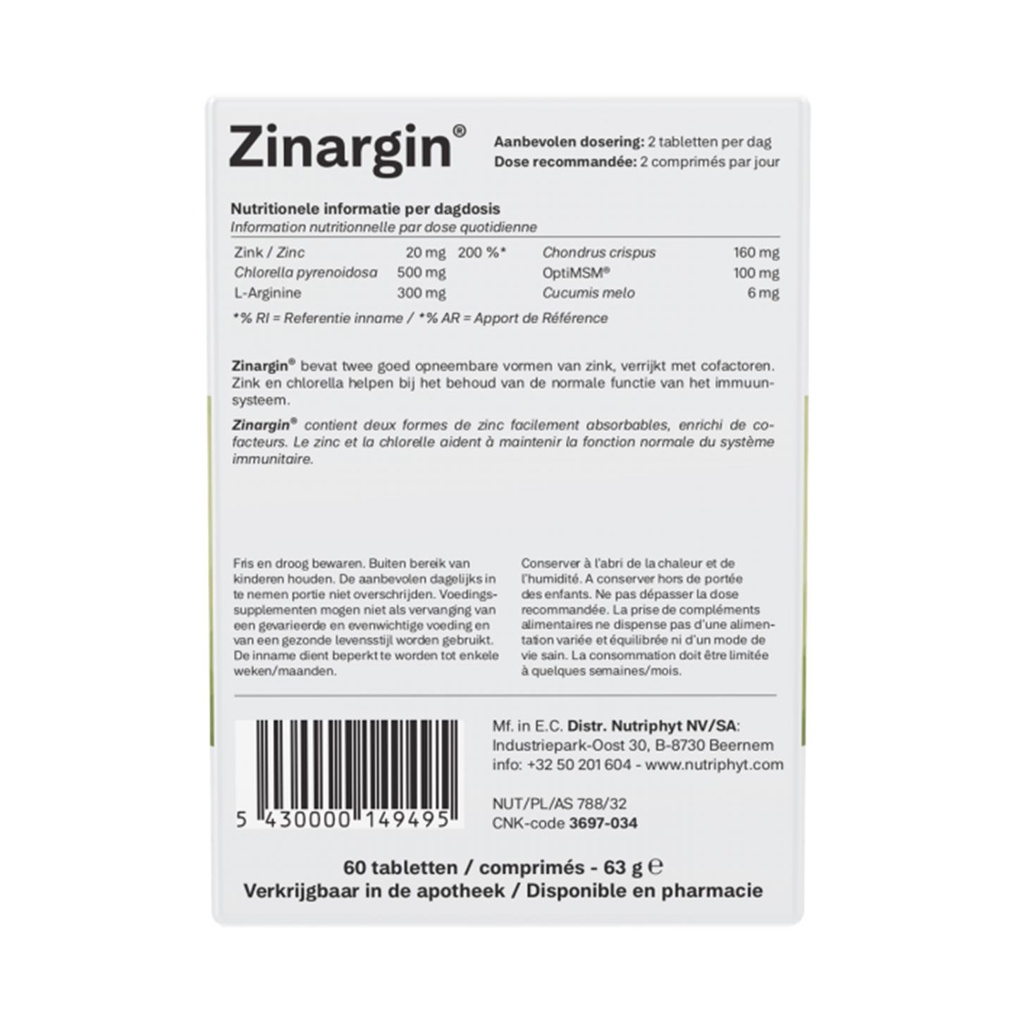 Vulstof (Microkristallijne cellulose), Chlorella (Chlorella pyrenoidosa), L-Arginine, Iers mos (Chondrus crispus), OptiMSM® (Methylsulfonylmethaan), Zinkgluconaat, Coating (Geleermiddel: Hypromellose, Emulgator: Glycerol), Rijstextract (Oryza sativa), Zinkmonomethionine, Glansmiddel (Stearinezuur), Suikermeloen (Cucumis melo).