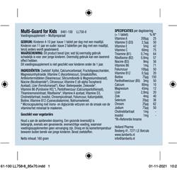 Zoetstof (Xylitol), Calciumcarbonaat, FOS (fructo-oligosacchariden), Magnesiumhydroxide, Vitamine C (ascorbinezuur), Smaakstoffen, Antiklontermiddelen (Stearinezuur, Siliciumdioxide, Magnesiumstearaat), Vitamine B3 (niacine, nicotinamide) (Mono- en diglyceriden van vetzuren), Citroenzuur, Vitamine E (dl-alfa-tocoferolacetaat), IJzerfumaraat (Mono- en diglyceriden van vetzuren), Kleurstof (Bietenpoeder), Zinkoxide (Mono- en diglyceriden van vetzuren), Vitamine B6 (pyridoxine HCl) (Mono- en diglyceriden van vetzuren), Vitamine B5 (calciumpantothenaat, pantotheenzuur), Vitamine B1 (thiaminemononitraat), Vitamine B2 (riboflavine) (Mono- en diglyceriden van vetzuren), Vitamine A (acetaat), Vitamine D3 (cholecalciferol), Cholinebitartraat, Inositol, Chroompicolinaat, Foliumzuur, Kaliumjodide, Biotine, Vitamine B12 (cyanocobalamine), Selenium (natriumseleniet).