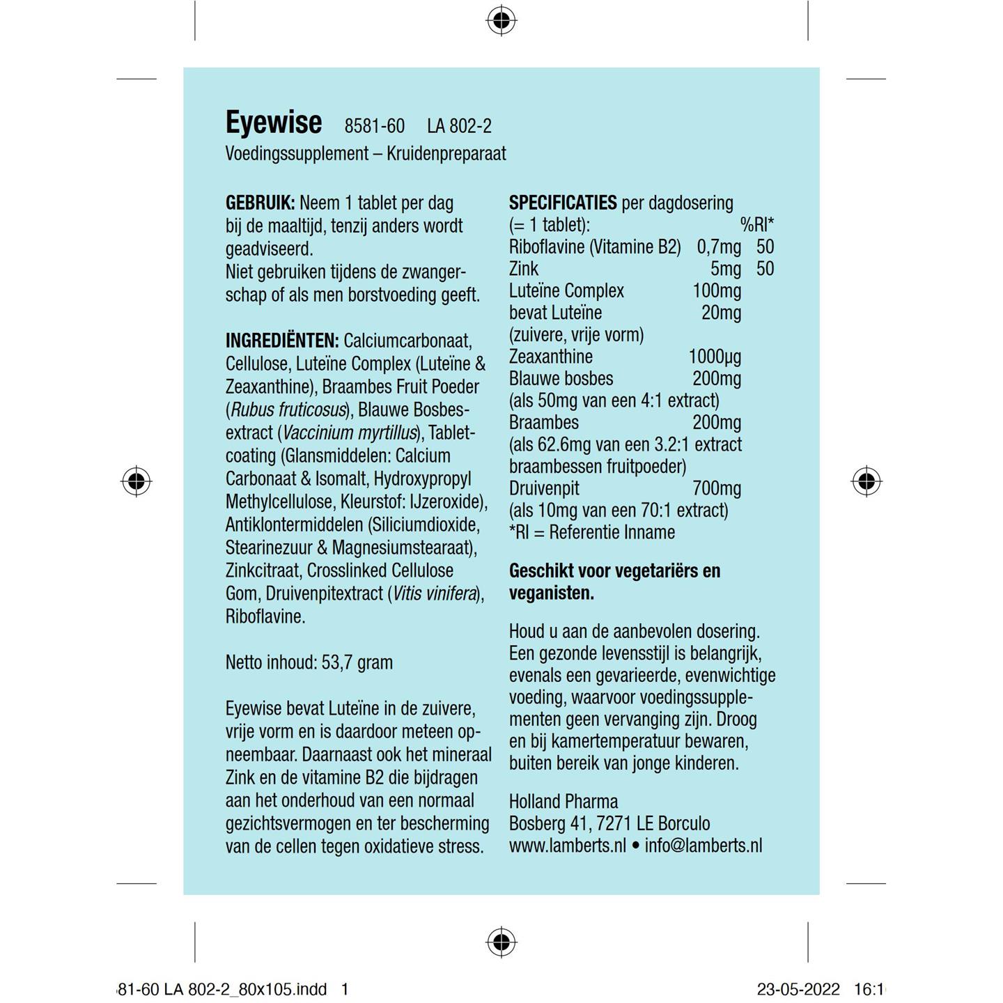 Calciumcarbonaat, Cellulose, Luteïne complex (Luteïne, Zeaxanthine), Braambes fruit poeder (Rubus fruticosus), Blauwe bosbesextract (Vaccinium myrtillus), Tabletcoating (Glansmiddelen: Calciumcarbonaat & Isomalt, Hydroxypropylmethylcellulose, Kleurstof: IJzeroxide), Antiklontermiddelen (Siliciumdioxide, Stearinezuur, Magnesiumzouten van vetzuren), Zinkcitraat, Crosslinked cellulosegom, Druivenpitextract (Vitis viniferae), Riboflavine.