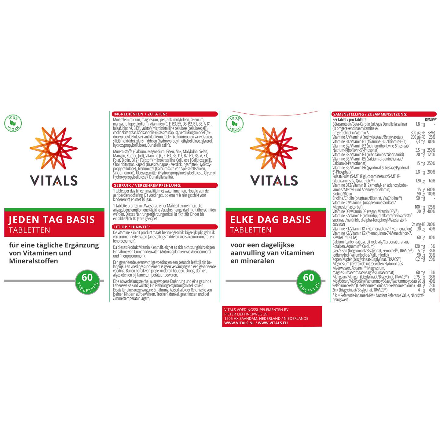 Mineralen, Vitaminen, Vulstof (Microkristallijne cellulose (cellulosegel)), Cholinebitartraat, Koolzaad (Brassica napus) olie, Verdikkingsmiddel (Hydroxypropylcellulose), Antiklontermiddelen (Calciumzouten van vetzuren, Siliciumdioxide), Glansmiddelen (Hydroxypropylmethylcellulose, Glycerol, Hydroxypropylcellulose), Dunaliella salina.