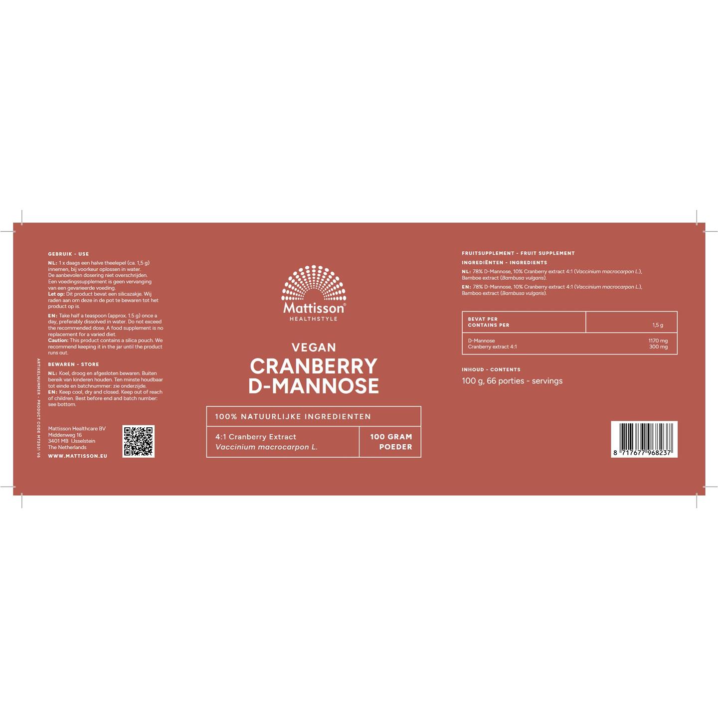 78% D-Mannose, 10% Cranberry extract 4:1 (Vaccinium macrocarpon L.), Bamboe extract (Bambusa vulgaris).