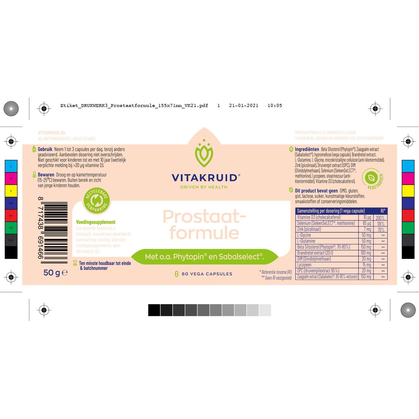 Bèta-sitosterol (Phytopin®), Zaagpalm extract (Sabalselect®), Veganistische capsule (Hypromellose), Brandnetel extract, L-Glutamine, L-Glycine, Antiklontermiddel (Microkristallijne cellulose), Zinkpicolinaat, Druivenpit extract (OPC), DIM (Diindolylmethaan), Selenium (SeleenSeLECT®, methionine), Lycopeen, Antiklontermiddel (Stearinezuur), Vitamine D3 (cholecalciferol).