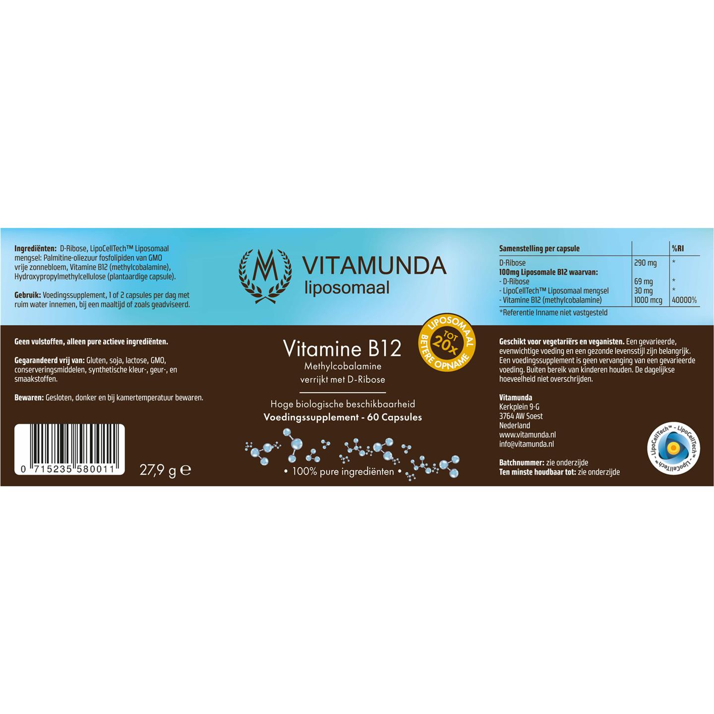 D-Ribose, LipoCellTech™ Liposomaal mengsel (Palmitine-oliezuur fosfolipiden van GMO vrije zonnebloem), Vitamine B12 (methylcobalamine), Plantaardige capsule (Hydroxypropylmethylcellulose).