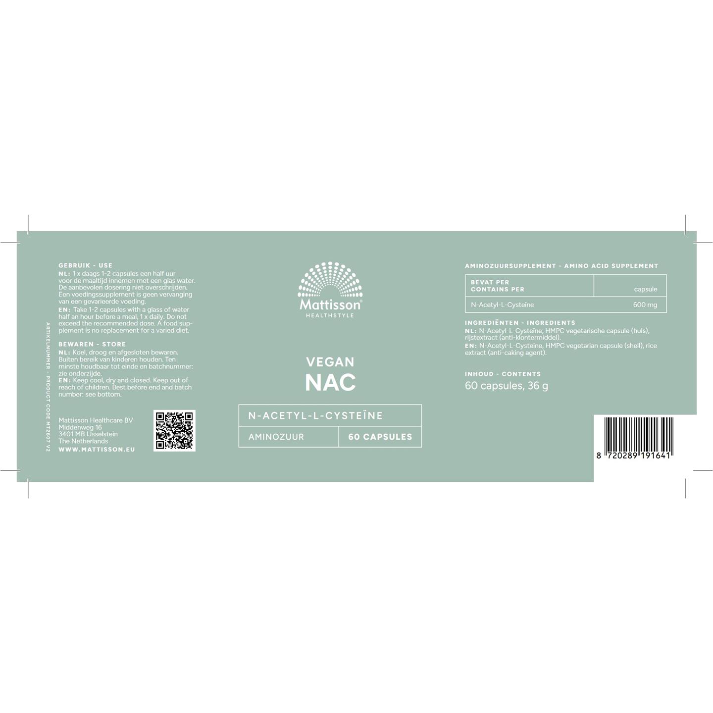 N-acetyl-L-cysteïne, HPMC vegetarische capsule (huls), Rijstextract (Anti-klontermiddel).