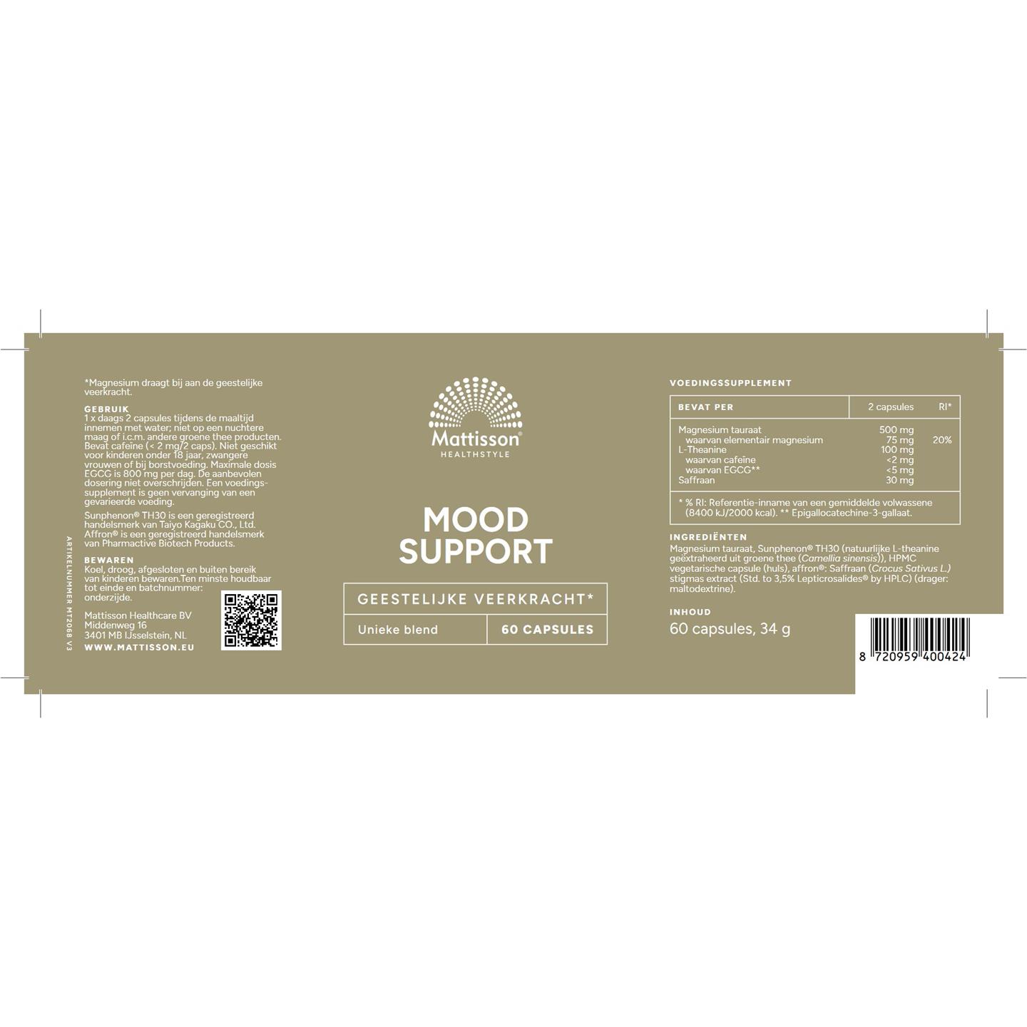 Magnesium tauraat, Sunphenon® TH30 (natuurlijk L-theanine geëxtraheerd uit groene thee (Camellia sinensis)), HPMC vegetarische capsule (huls), Affron®: Saffraan (Crocus sativus L.) stigmas extract (Std. to 3,5% Lepticrosalides® by HPLC) (Drager: Maltodextrine).