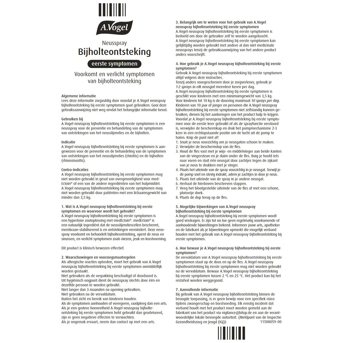 A.Vogel Neusspray bijholteontsteking bij eerste symptomen naar behoefte meerdere keren per dag 1-2 maal sprayen per neusgat.