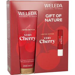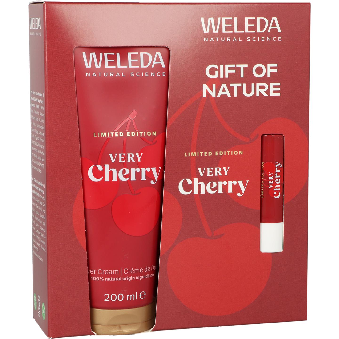 Very Cherry Douchecrème: Water (Aqua), Helianthus Annuus (Sunflower) Seed Oil*, Alcohol denat., Coco-glucoside, Disodium cocoyl glutamate, Glycerin, Fragrance (Parfum), Sodium cocoyl glutamate, Carrageenan, Citric acid, Xanthan gum, Limonene, Linalool, Geraniol, Coumarin, Very Cherry Lippenbalsem: Simmondsia Chinensis (Jojoba) Seed Oil*, Beeswax (Cera Alba), Euphorbia Cerifera (Candelilla) Wax, Butyrospermum Parkii (Shea) Butter*, Copernicia cerifera (Carnauba) wax, Fragrance (Parfum), Limonene, Linalool, Geraniol, Eugenol.