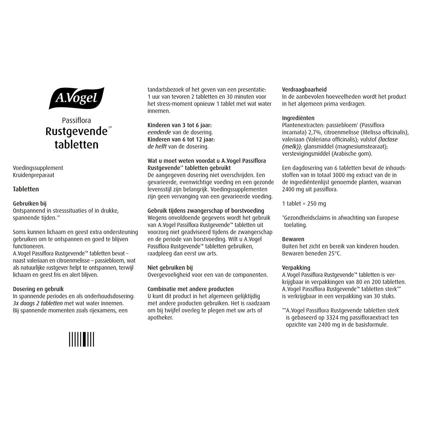 Plantenextracten (Passiebloem (Passiflora incarnata), Citroenmelisse (Melissa officinalis), Valeriaan (Valeriana officinalis)), Vulstof (Lactose, (Melk)), Glansmiddel (Magnesiumstearaat), Verstevigingsmiddel (Arabische gom).