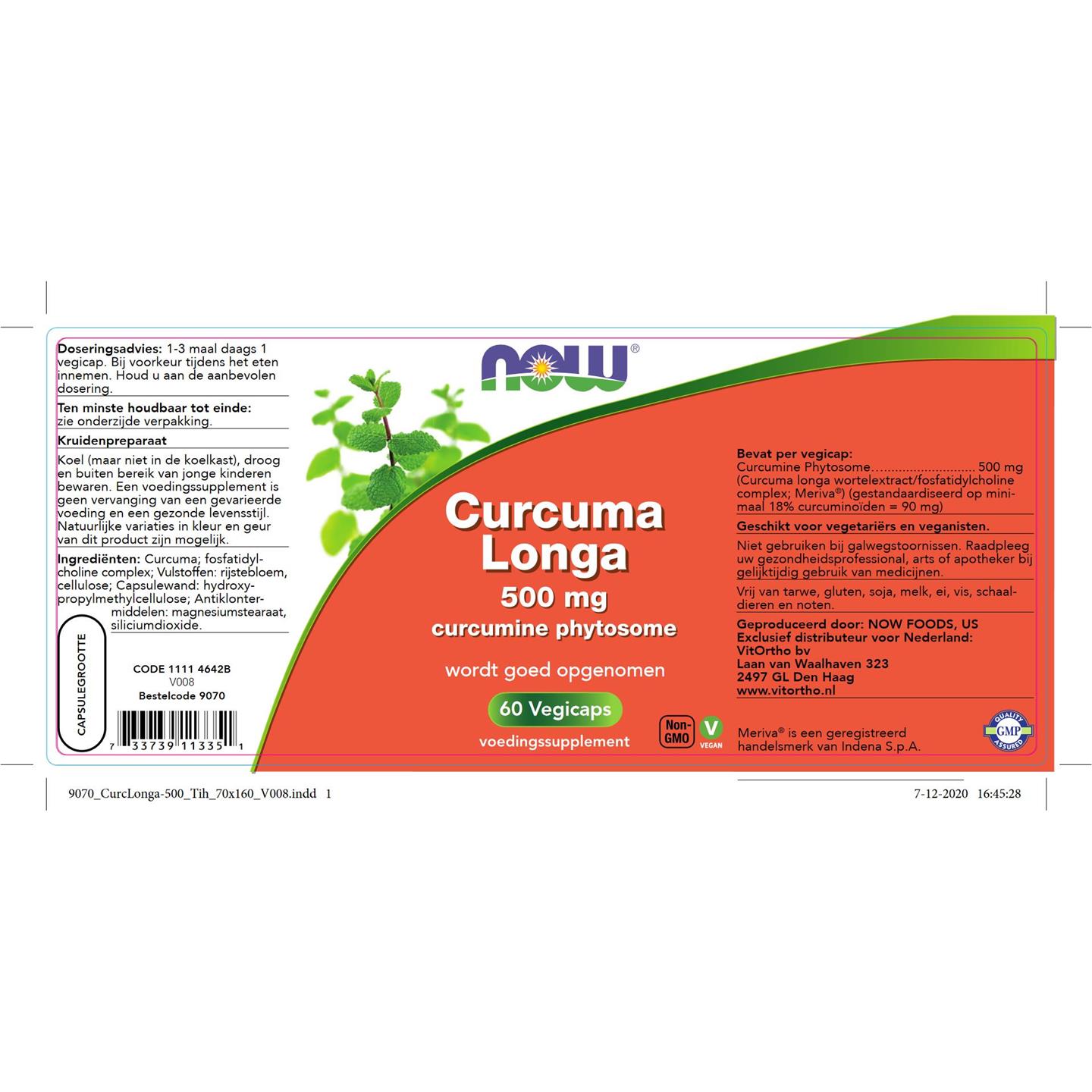 Curcuma longa wortel extract, Fosfatidyl choline complex, Vulstoffen (Rijstebloem, Cellulose), Capsule (Hydroxypropylmethylcellulose), Antiklontermiddelen (Magnesiumstearaat, Siliciumdioxide).