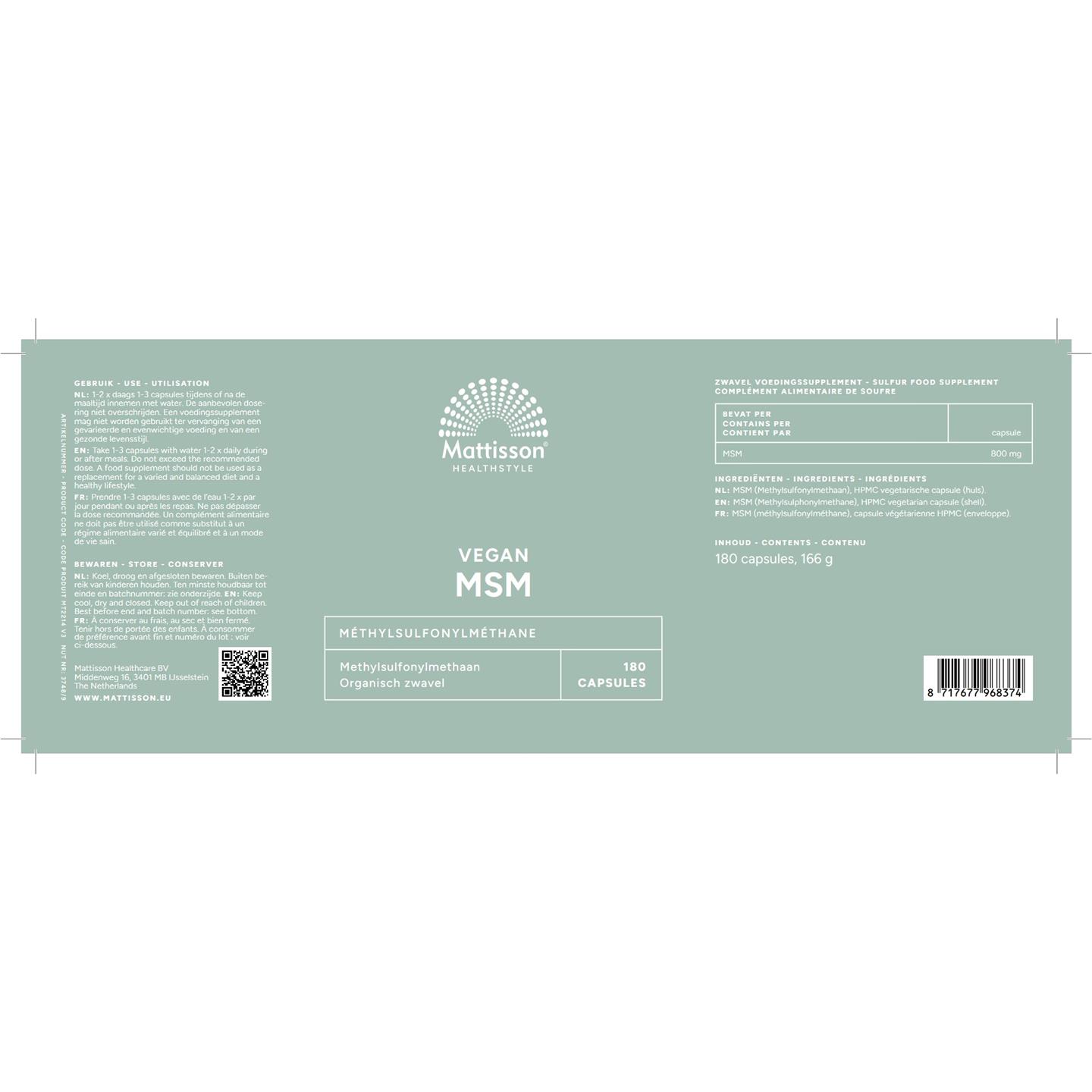 MSM (Methylsulfonylmethaan), HPMC vegetarische capsule (huls).