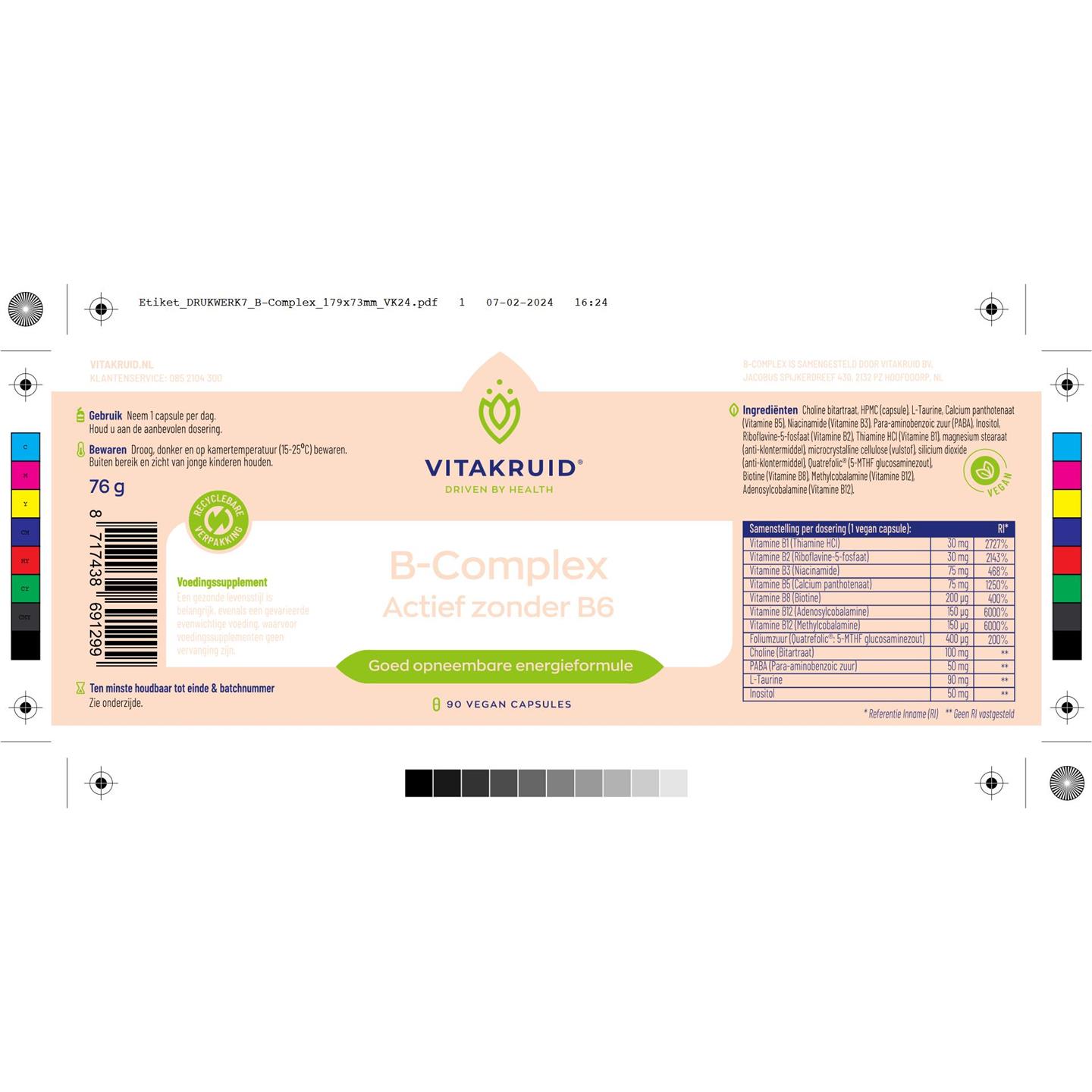 Cholinebitartraat, Capsule (HPMC), L-Taurine, Calcium panthotenaat (Vitamine B5), Niacinamide (vitamine B3), Para-aminobenzoic zuur (PABA), Inositol, Riboflavine-5-fosfaat (Vitamine B2), Thiamine HCl (Vitamine B1), Antiklontermiddel (Magnesiumstearaat), Vulstof (Microcrystalline cellulose), Antiklontermiddel (Siliciumdioxide), Quatrefolic® (5-MTHF glucosaminezout), Biotine (vitamine B8), Methylcobalamine (vitamine B12), Adenosylcobalamine (Vitamine B12).